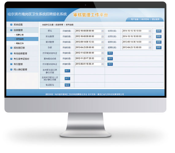 系統(tǒng)設(shè)置:注冊時間段、報名時間段、改報時間段、繳費時間段等的設(shè)置,控制考生的操作流程。