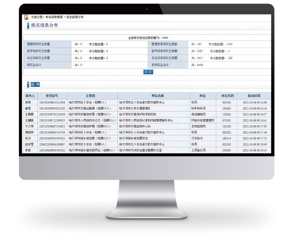 - 隨時統(tǒng)計當(dāng)前報名各類數(shù)據(jù)(按崗位、按用人單位、按考試科目)。