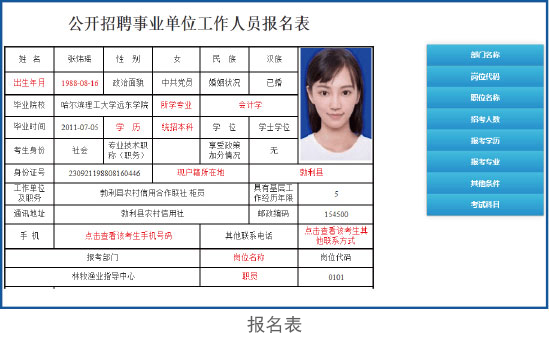 - 完善的權(quán)限控制,可以控制各個用人單位主管部門(如衛(wèi)生局)只能審核報考其相關(guān)崗位的考生報名表。